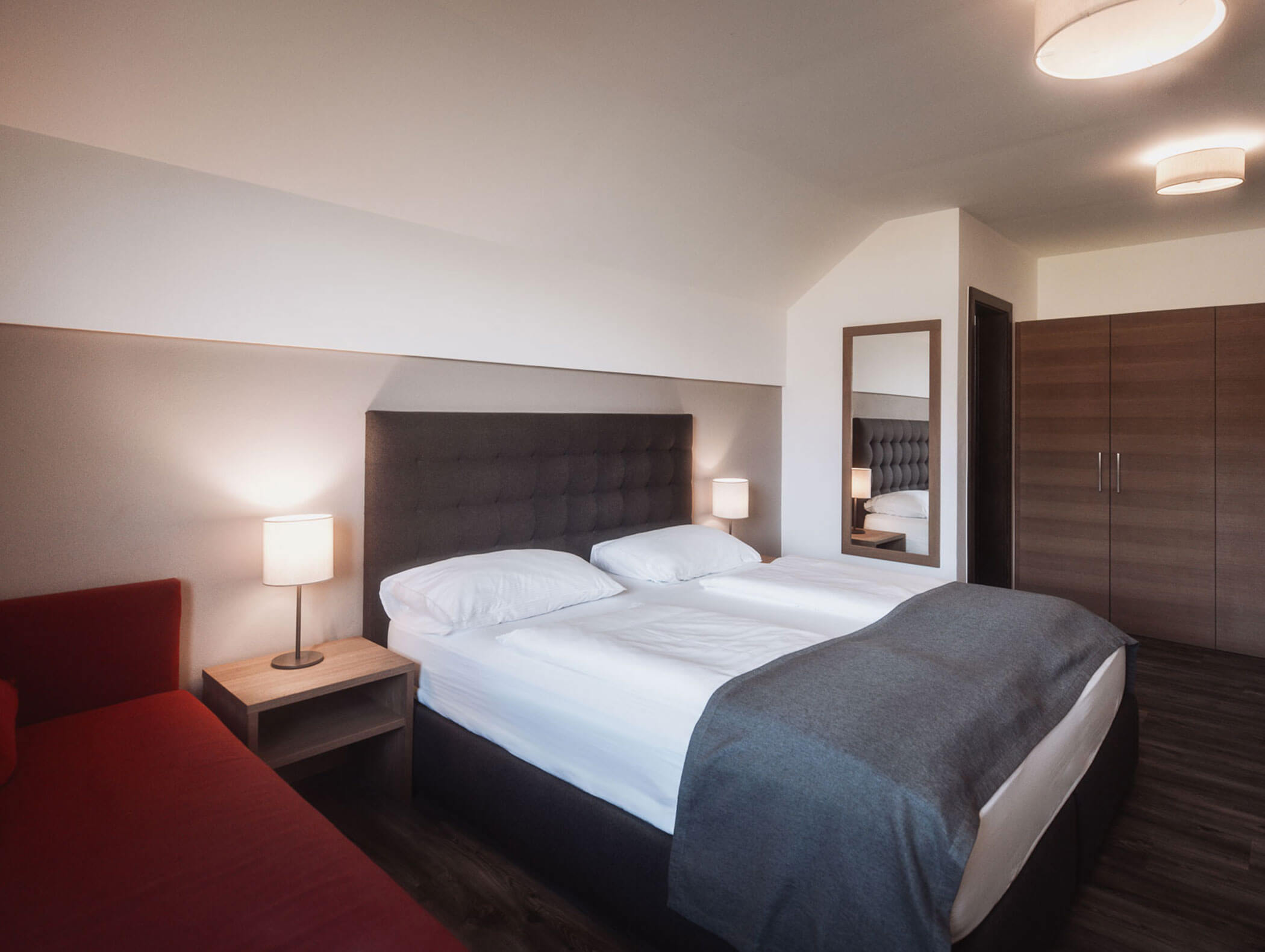 Ubytováni budete na pokojích s vlastním sociálním zařízením, wi-fi, trezorem, minibarem a TV. Některé pokoje mají balkón. Část pokojů je zařízena v honosném tyrolském stylu často s dřevěným stropem a trámy, jiné jsou spíše moderní a designové.