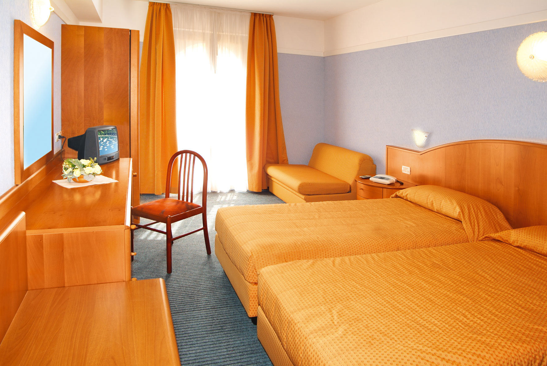 Dvoulůžkový pokoj Standard s přistýlkami (cca 12-16 m2, min. 2 dospělí / max. 2 dospělí + 2 děti) : sprcha/WC, fén, telefon, SAT-TV, klimatizace (v provozu červenec - srpen, dle uvážení vedení hotelu), topení, balkón nebo terasa